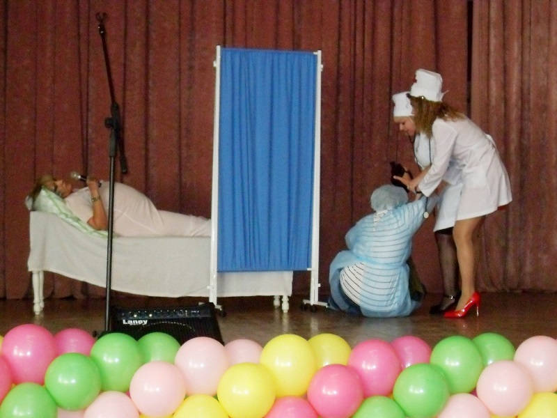 «Тропинку» на конкурсе представляли медсестра детского отделения Римма Бурдули, выступившая с вокальным номером, а также группа сотрудников амбулаторно-поликлинической службы, подготовившая театрализованную юмористическую сценку «На родах».