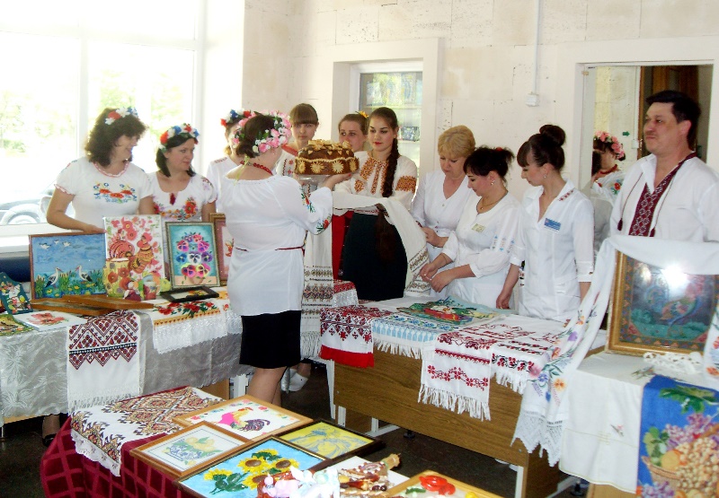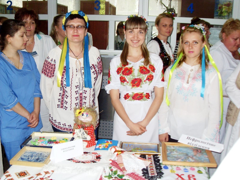 В 12 часов дня в холле поликлиники №1 открылась выставка декоративно-прикладного творчества работников больницы. Свои самобытные экспозиции – вышитые рушники, рубашки, салфетки, картины, миниатюры в национальном стиле – представили все структурные подразделения. Одновременно с выставкой проходил флешмоб вышиванок, во время которого наши медики в национальной одежде, презентуя свои работы, общались, делились впечатлениями и с удовольствием фотографировались.