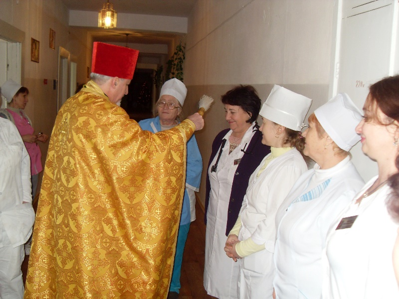 Сегодня, в День Крещения Господнего или Богоявления клирик больничного храма святой великомученицы Варвары, расположенного на территории клинической больницы им. А. и О. Тропиных, отец Олег окропил святой водой с молитвой о здравии сотрудников и болящих.