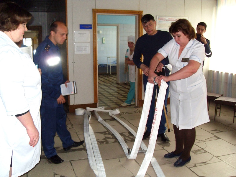 В проимитированных чрезвычайных ситуациях медперсонал незамедлительно приступил к отработке навыков действий. Была произведена эвакуация персонала, пациентов и посетителей поликлиники из условно опасной зоны возгорания и задымления. С помощью первичных средств пожаротушения удалось локализовать условный очаг возгорания, предупредив развитие пожара. Также были выполнены первоочередные мероприятия по катастрофическому затоплению.
