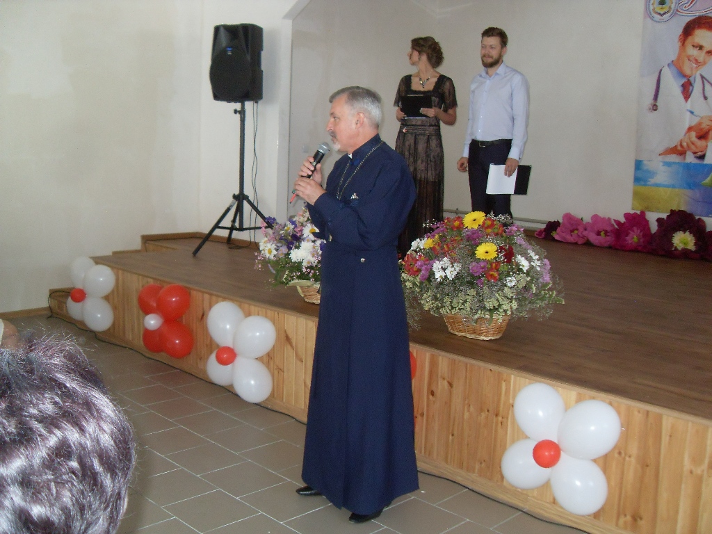 Священник больничного храма Олег Стецюк коснулся исконного – самого слова «врач», которое образовано с помощью суффикса «-чь» и слова «вьрати», что значит – «говорить». Первоначально – «заговаривающий», «волшебник». Отец Олег подчеркнул, что присутствие чуда в медицине – по-видимому, это то, что творит эту профессию. Он пожелал всем медикам сохранить в себе своё предназначение, ту чуткую связь с Божьим, которая помогает каждый день на своей работе совершать чудо – возвращать людям здоровье.