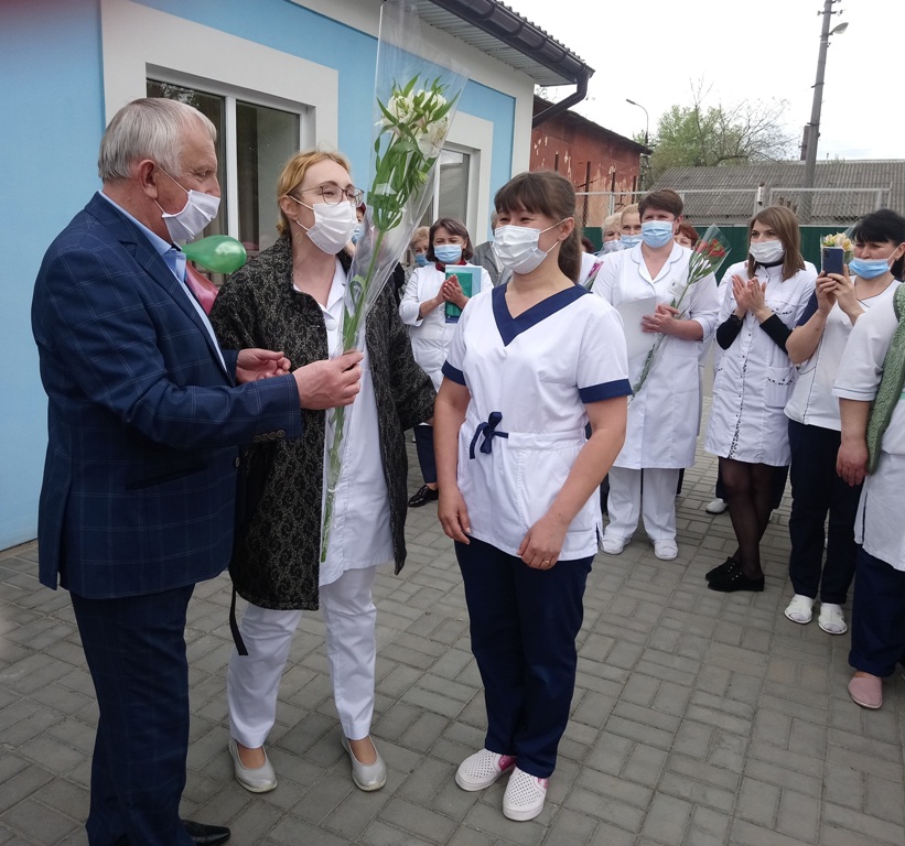 В лікарні Тропіних сьогодні вітали медичних сестер з професійним святом. Адміністрація запросила сестринський колектив зібратися у дворі лікарні, близько святково прикрашеного конференц-залу, щоб в нон-стоп режимі, практично без відриву від роботи, побачити один одного, привітати та зарядитися енергією доброти, взаємопідтримки та оптимізму.
