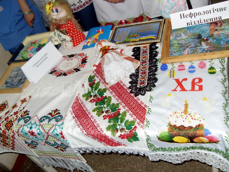 В 12 часов дня в холле поликлиники №1 открылась выставка декоративно-прикладного творчества работников больницы. Свои самобытные экспозиции – вышитые рушники, рубашки, салфетки, картины, миниатюры в национальном стиле – представили все структурные подразделения. Одновременно с выставкой проходил флешмоб вышиванок, во время которого наши медики в национальной одежде, презентуя свои работы, общались, делились впечатлениями и с удовольствием фотографировались.