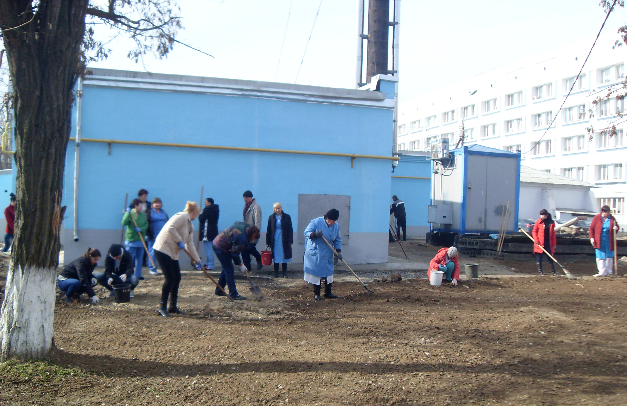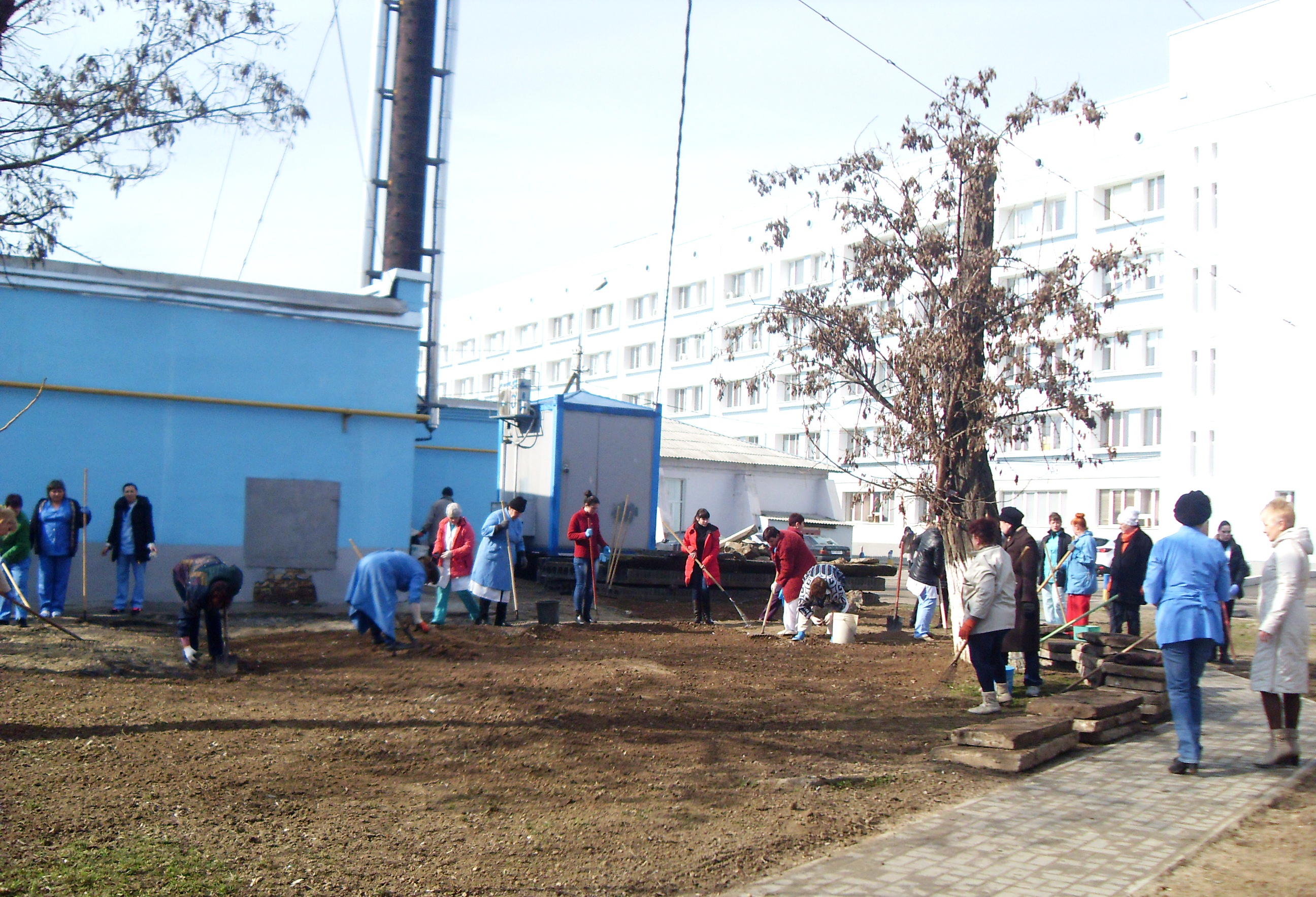 Сегодня, в субботу, сотрудники всех подразделений больницы вышли на улицу, чтобы привести в порядок территорию, убрать оставшийся после зимы мусор, вскопать клумбы и другие участки, высадить корневые саженцы.
